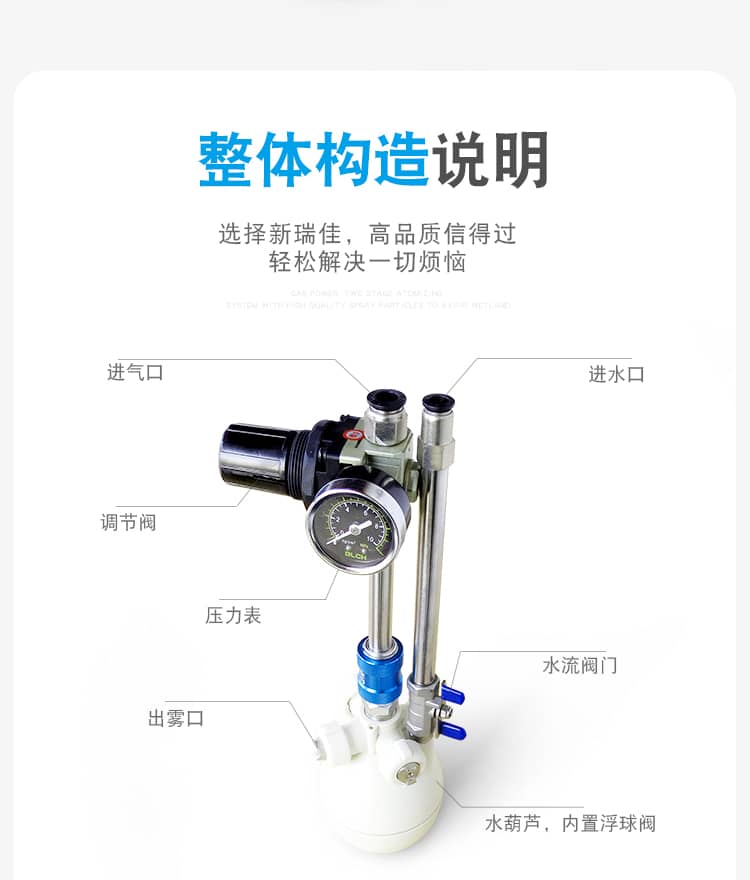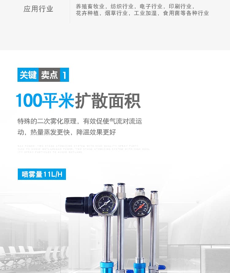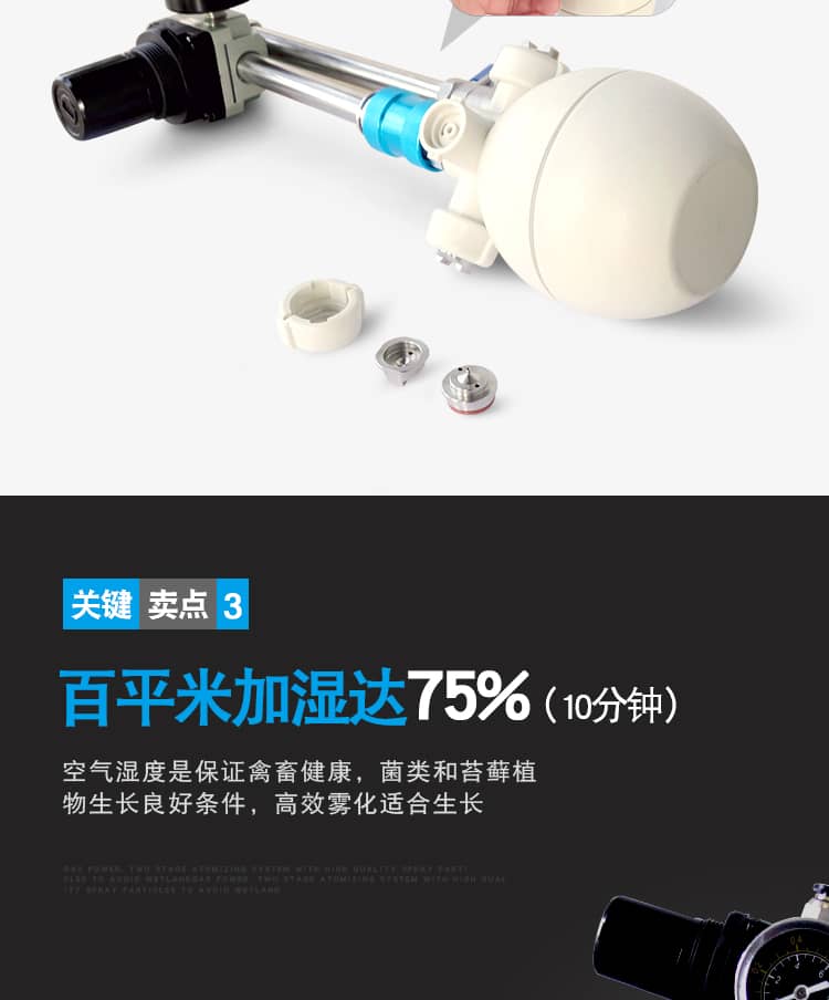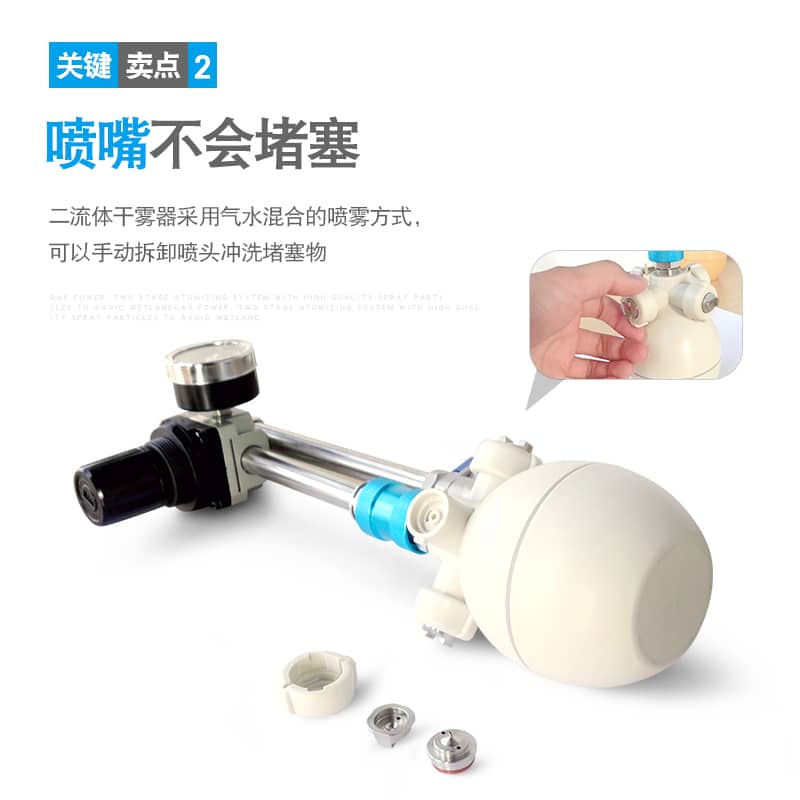 4、高质量的喷雾颗粒,雾化效果好,特别的真空阀设计,压缩空气负压诱导加湿,避免湿地发生;