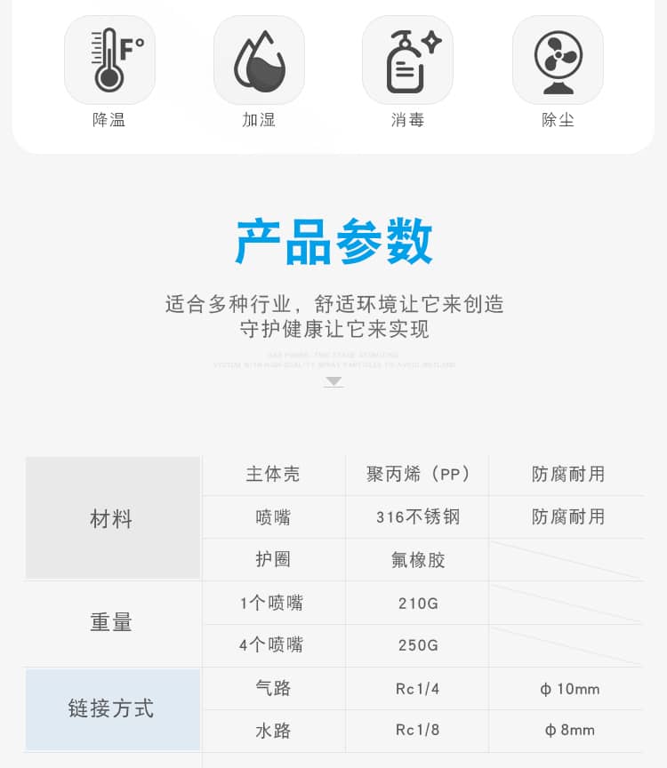 环境空气加湿的效果,还可以起到一定的降温效果、防静电效果(湿度高了,静电的产生就降低了)、除尘降尘抑尘等