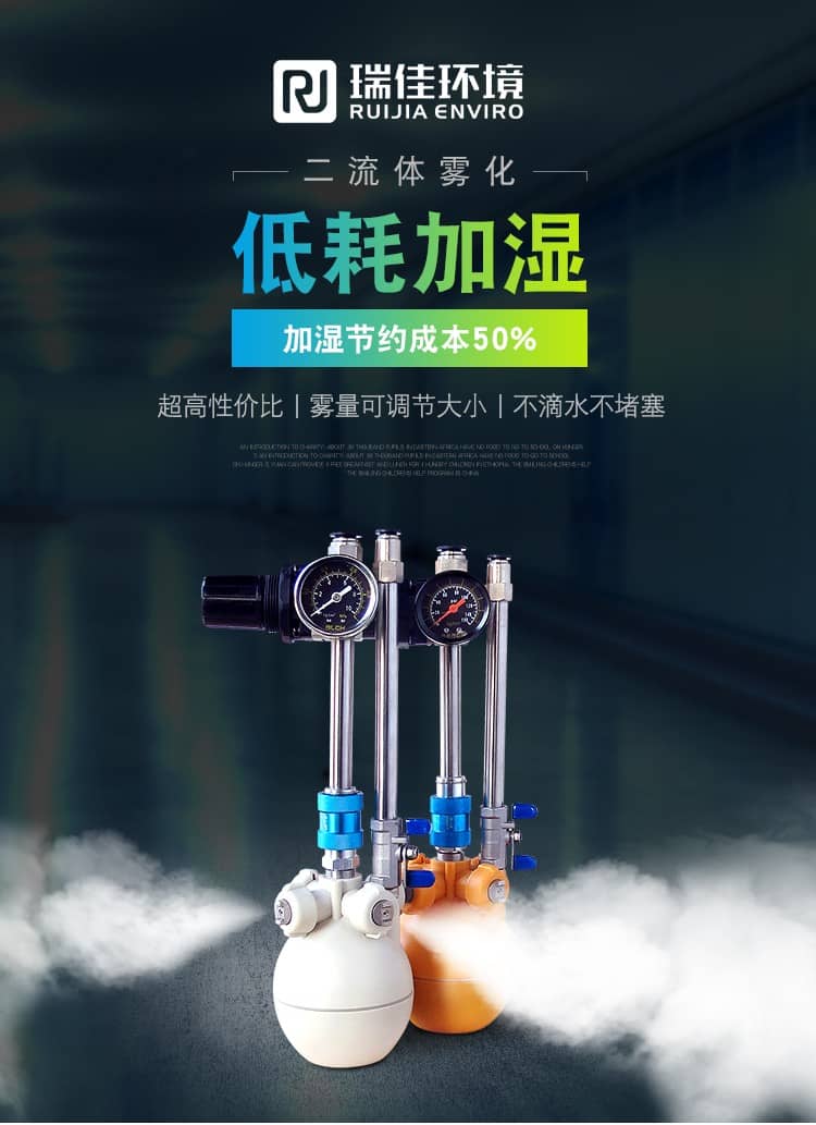 瑞佳加湿系统采用真空虹吸的原理工作,分离的压缩气体和液体在特制的不锈钢喷头处汇合,生成两级雾化系统的超细薄雾。在两级雾化系统中,气水混合物从中心孔喷出,实现次雾化;再与从旁边喷孔出来的气全混合,实现第二次雾化。根据需要进行调节水和气的压缩比,获得的喷雾效果;喷雾颗粒大小:6μm-10μm.汽水混合喷雾加湿系统是由 干雾加湿器 +控制组件 + 安装组件 + 气/水管路 + 湿度检测设备 + 水质过滤设备 组成。