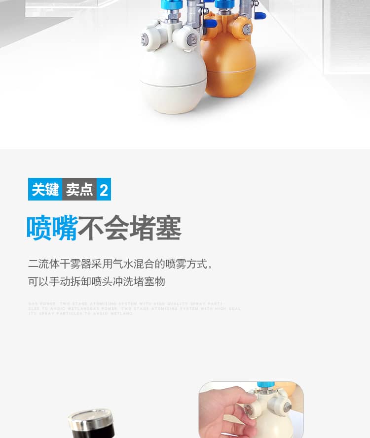 6、气路延时设计,有效防止喷嘴堵塞;气、水路混配、免维护设计,解决了传统喷雾工艺方式喷嘴易堵塞的问题。